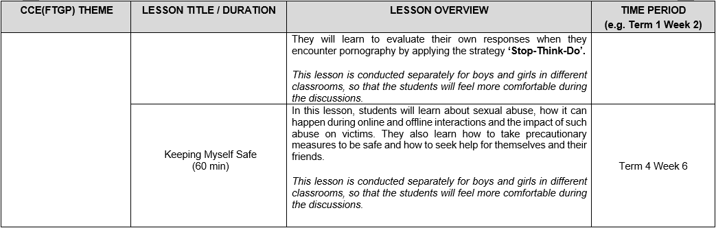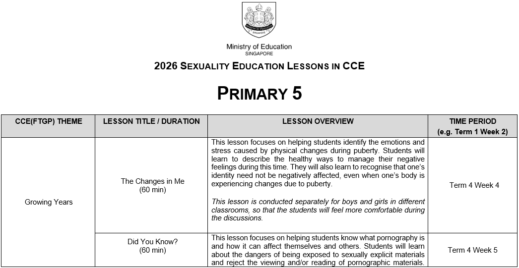 At Si Ling Primary School, the following Sexuality Education lessons will be taught in 2026: